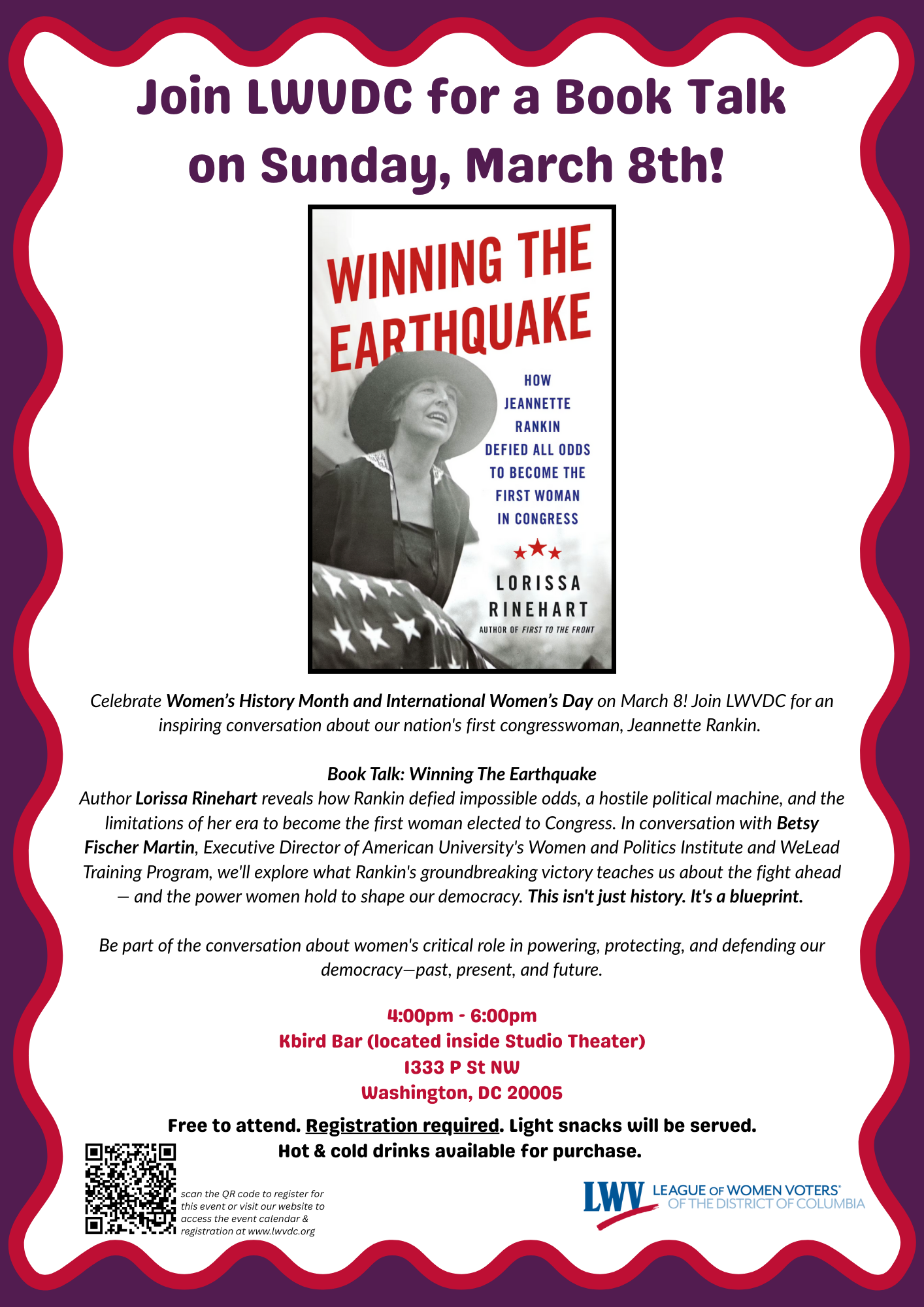 Celebrate Women's History Month and International Women's Day on March 8! Join LWVDC for an inspiring conversation about our nation's first congresswoman, Jeannette Rankin.
